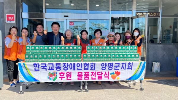 이날 전달식에서 한국교통장애인협회 양평군지회가 기부한 샴푸 80통은 아름다운동행 봉사회가 40통은 관내 취약계층에 전달하고 나머지 40통은 자체 바자회를 통해 판매해 김장 나눔 후원금을 마련할 계획이라고 전했다.