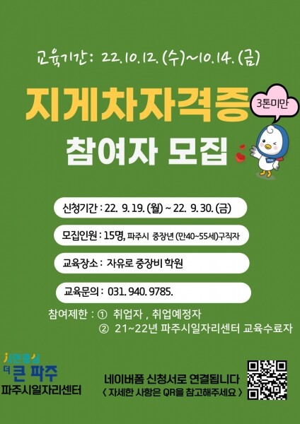 이번 교육은 파주시에 주민등록을 둔 만 40세~55세 이상의 취업희망자로 자동차 운전면허 1종 보통 이상 소지자라면 누구나 신청이 가능하다.