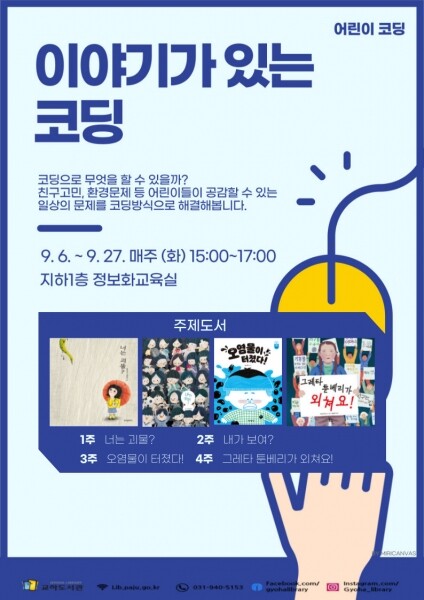 이야기가 있는 코딩은 ‘코딩과 메이킹으로 읽는 생생한 동화 속 이야기’라는 주제로 사서와 함께 그림책을 읽고 문제해결을 위한 시나리오를 만들어 시나리오에 따른 코딩과 메이킹을 하는 등 다양한 창작활동을 직접 실습해본다.