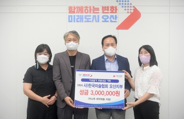 이날 사)한국미술협회 오산지부 이준석 회장은 “오산시에서 힘들게 생활하는 저소득 가정들에게 작은 도움을 주고자 하는 뜻에서 성금을 기탁하게 됐다”며 “어려운 이웃들을 위한 나눔 활동을 지속적으로 펼치겠다”고 소감을 말했다.