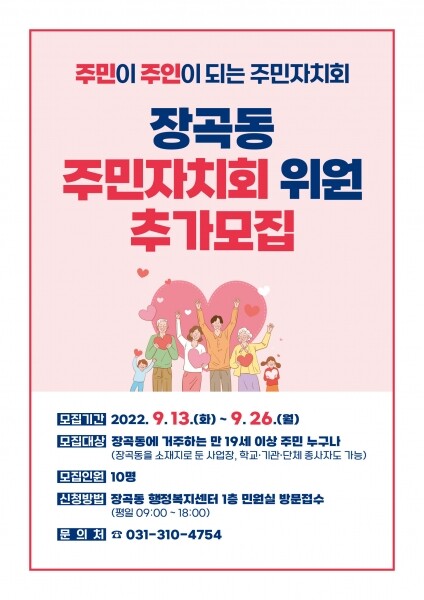 모집 대상은 공고일 현재 만 19세 이상 주민으로 장곡동에 주민등록이 돼 있거나 장곡동에 소재한 사업장 종사자, 학교·기관·단체에 종사하는 임·직원이 해당된다.