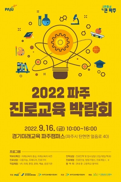 이번 박람회는 파주시, 파주교육지원청 및 파주진로체험지원센터가 공동 주최, 파주진로체험지원센터가 주관했으며 지역 대학과 마을의 진로체험처가 진로·진학 정보를 상호 교류하고 학생과 학부모에게 제공하기 위해 마련됐다.