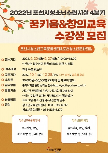 관내 유아·청소년을 대상으로 선착순으로 모집하며 신청은 포천시 청소년수련시설 홈페이지에서 신청하면 된다.