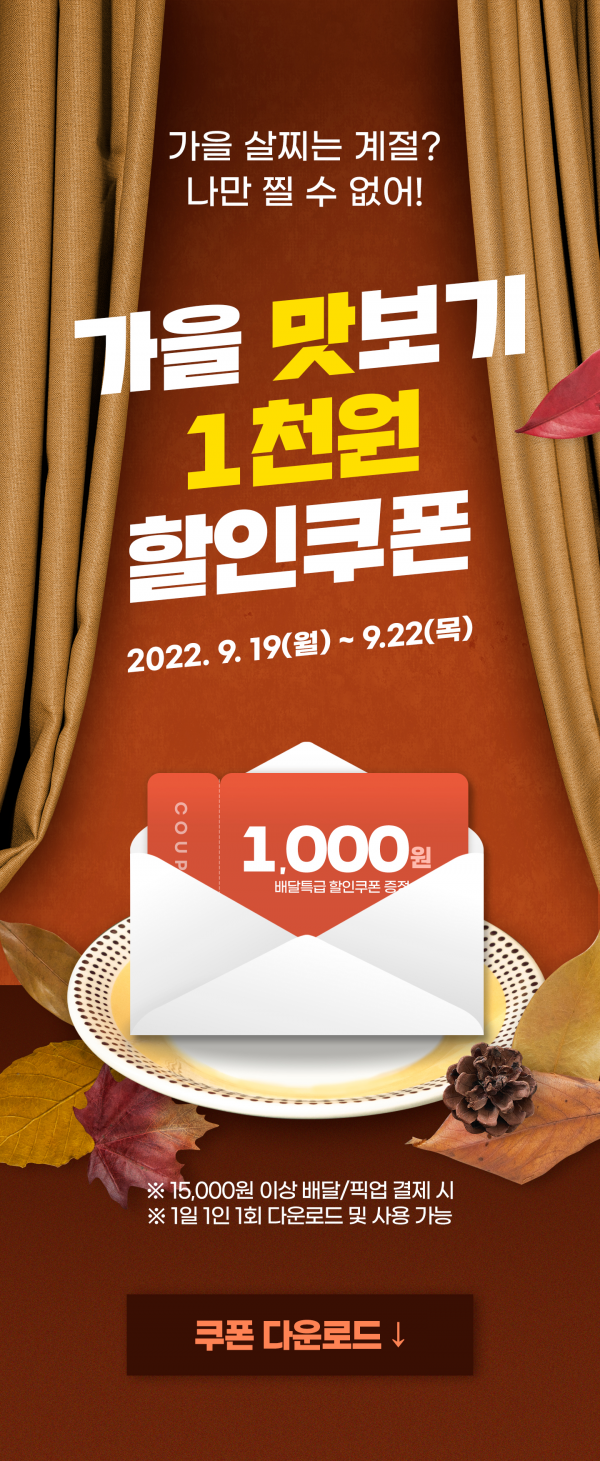 경기도주식회사는 19일 월요일부터 오는 22일 목요일까지 나흘간 배달특급 전체 회원을 대상으로 ‘가을 맛보기 할인’ 이벤트를 진행한다고 밝혔다.