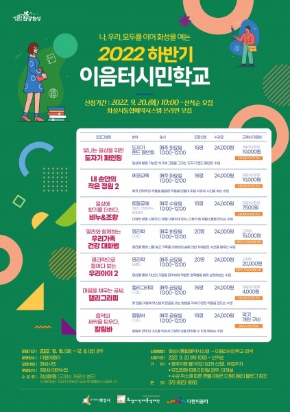 이음터시민학교 프로그램에 대한 자세한 사항과 신청은 다원이음터 블로그와 화성시통합예약시스템에서 확인할 수 있다.