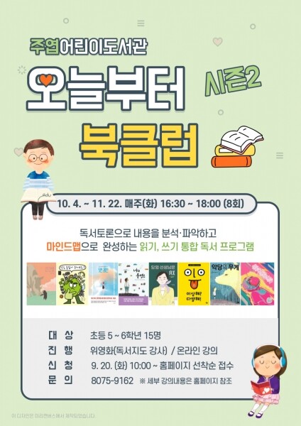 수업은 초등 5~6학년을 대상으로 10월 4일부터 11월 22일까지 매주 화요일 오후 4시 30분부터 6시까지 총 8회에 걸쳐 온라인으로 운영하며 위영화 독서지도 강사가 진행한다.