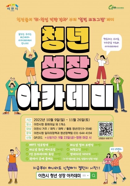 이번 아카데미는 이천시에 거주하거나 활동하고 있는 만19세 이상 만39세 이하의 청년이면 누구나 참여 가능하며 신청은 9월 23일부터 QR코드를 통해 접수하면 된다.