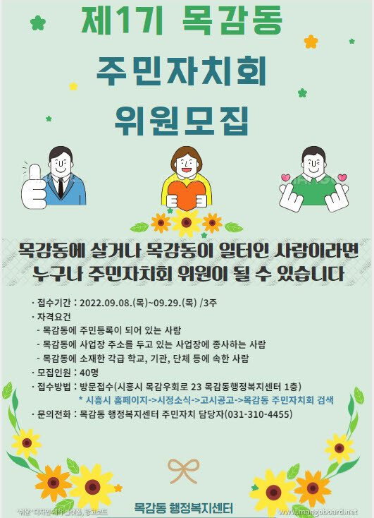 주민자치회 위원 공개모집 기간은 9월 8일부터 29일까지이며 서류심사와 면접심사로 최종 제1기 목감동 주민자치회 위원을 선정한다.
