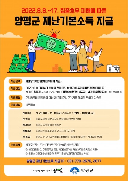 읍·면사무소 현장에 비치된 재난기본소득 신청서를 제출하면 집중호우에 따른 피해사실 확인 후 세대주가 기존에 보유한 양평군 지역화폐로 재난기본소득 50만원이 지급된다.