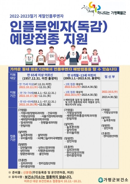 다만 달걀 알레르기가 있는 어린이는 ‘세포배양 백신’으로 접종이 이루어지며 해당 접종은 다음달 5일부터 가평군보건소와 설악면 우리들의원에서 접종이 가능하다.