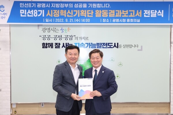 시정혁신기획단은 이날 민선8기 시정철학, 목표, 3대 전략을 비롯해 17대 약속, 80대 시정과제, 117개 공약을 담은 활동 결과 보고서를 박승원 광명시장에게 전달했다.