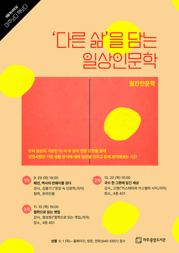 두 번째 강연은 10월 20일 고영 작가의 ‘국수 한 그릇에 담긴 세상’을 주제로 한 강연이, 세 번째 강연은 11월 10일 함성호 시인이자 건축가의 ‘철학으로 읽는 옛집’을 주제로 강연한다.