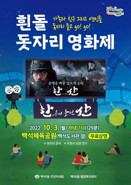 ‘흰돌 돗자리 영화제’ 행사는 10월 3일 개천절 저녁7시 백석체육공원에서 상영되며 지역주민이 돗자리 및 간이 의자 등을 지참해 자유롭게 관람이 가능하다.