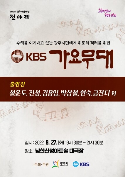 시 관계자는 “지난 8월 기록적인 폭우로 인해 어려움을 겪는 시민 여러분께 희망의 메시지를 전하고자 이번 공연을 마련했다”며 “광주시민 모두가 함께 즐길 수 있는 안전하고 행복한 공연이 될 수 있도록 하겠다”고 말했다.