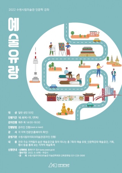 수원시립미술관 김진엽 관장은 “전국의 문화 공간을 소개하는 인문학 강좌를 통해 자유롭게 여행하며 지역의 특성에 대해 알아보고 예술을 편안하게 접하는 기회가 되길 바란다”고 전했다.