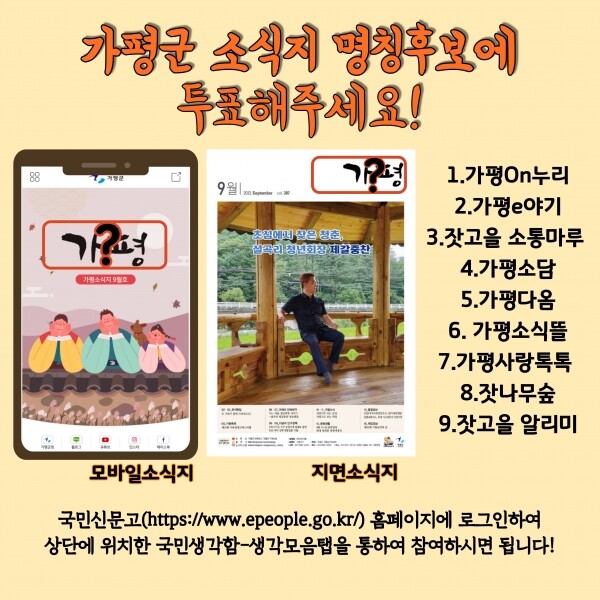 가평군은 지난 8월 가평군 소식지 명칭 공모전을 개최하며 300여 건에 가까운 명칭을 공모받았으며 내부 회의를 통해 사전 심사 및 1차 심사를 거쳐 9건을 선정해 국민생각함에 투표를 개시했다.