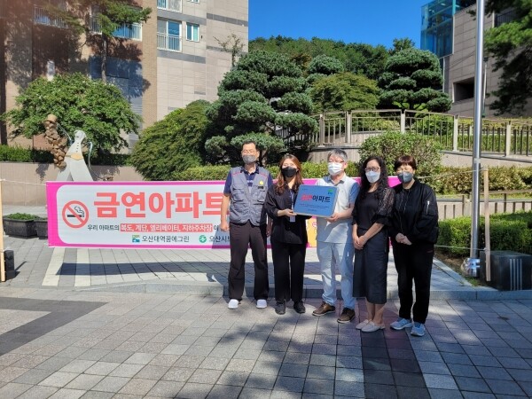 오산시보건소는 제17호 금연아파트 지정에 따라 아파트 주출입구 등에 금연구역임을 알리는 현판, 현수막 및 스티커를 지원하고 홍보 리플릿 배부 등 입주민 대상 비대면 홍보를 시행했다.