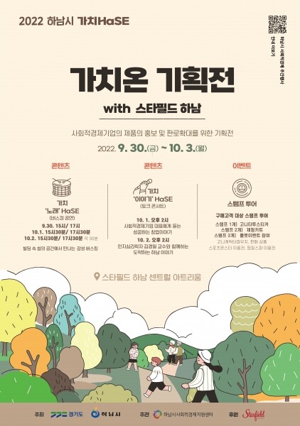 이번 사회적경제 주간행사는 하남시청 별관에서 28일 가치 상담HaSE를 시작으로 스타필드 하남에서 30일∼10월 3일 가치온 기획전 가치 노래HaSE 가치 이야기HaSE 등이 개최된다.