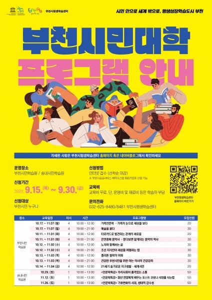 이번 부천시민대학은 오는 10월 11일부터 오전과 저녁, 부천시민학습원과 송내시민학습원에서 진행될 예정이다.