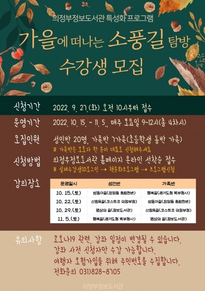 수강 신청은 9월 27일 오전 10시부터 의정부정보도서관 홈페이지 책문화프로그램 코너에서 온라인 선착순 접수로 진행된다.
