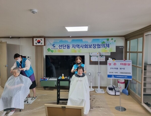 사업은 2022년 선단동 지역사회보장협의체 특화사업으로 선정된 ‘거동불편 어르신들을 위한 찾아가는 마을 복지사업’의 일환으로 보장협의체 위원 중 미용실을 운영 중인 김영미 원장과 자원봉사자 양아람 씨의 재능 나눔으로 진행했다.