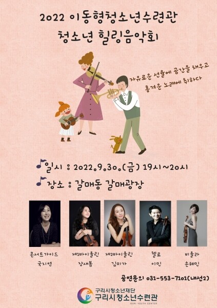 이번 ‘청소년 힐링음악회’ 는 바이올린, 비올라, 첼로 연주자로 구성된 현악 4중주 공연으로 일반인들에게도 널리 알려진 클래식 음악을 비롯해 영화와 애니메이션 OST 등으로 선곡 목록을 구성해 어느 연주회와는 달리 큰 공감대를 형성할 것으로 기대된다.