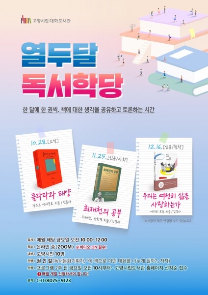 ‘열두달 독서학당’은 한 달에 한 권씩 책에 대한 생각을 공유하고 토론하는 독서토론 프로그램으로 인문학을 주제로 한 열두달 인문학당 프로그램에 이어 독서를 주제로 한 대화도서관 대표 프로그램이다.