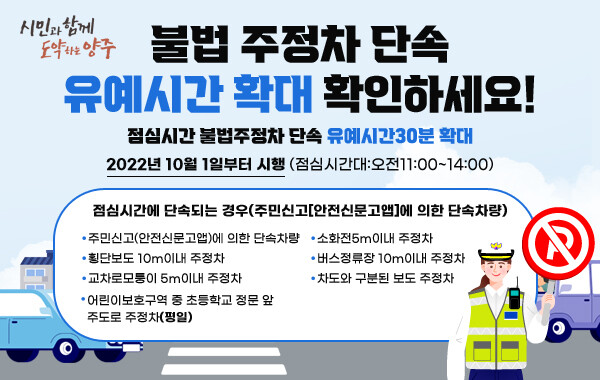 이는 민선 8기 양주시 공약사항 중 하나인 ‘주정차 단속 신축적 운영’의 일환으로 물가 상승과 코로나19 재확산 우려로 위축된 지역 상권을 활성화하고 시민 주차 편의를 높이기 위한 조치다.