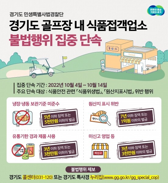 김민경 경기도 민생특별사법경찰단장은 “코로나19 장기화 등으로 감염 가능성이 낮은 실외활동으로 골프장 이용 수요가 증가하고 있는 만큼, 골프장 내 식품접객업소 불법행위를 집중 단속해 도민에게 안전한 먹거리 환경을 제공하고 불법행위 예방에 최선을 다하겠다”고 말했다.