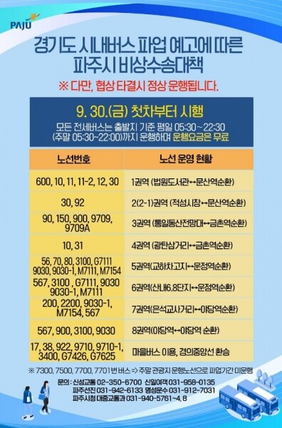 파주시 관계자는 “노선버스 운행이 중단될 경우 출퇴근 시간대 불편이 예상되므로 파주시 홈페이지 등을 통해 비상수송 종합대책을 꼭 확인하고 이용해 줄 것”을 당부했다.