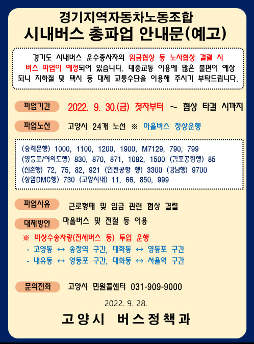 시는 해당 노선의 운행 중단 시 파업에 참여하지 않는 고양시 시내버스 및 전세버스 등 24대를 긴급 투입해 대체교통수단을 제공할 계획이라고 전했다.