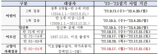만 13세 이하 어린이 및 임신부, 만 65세 이상 어르신은 국가 예방접종 대상으로 지정 위탁의료기관에 방문하면 지역 상관없이 무료로 접종 받을 수 있따.대상자별 접종일정 및 고양시 지정 위탁의료기관은 고양시보건소 홈페이지, 예방접종 도우미 사이트에서 확인할 수 있다.