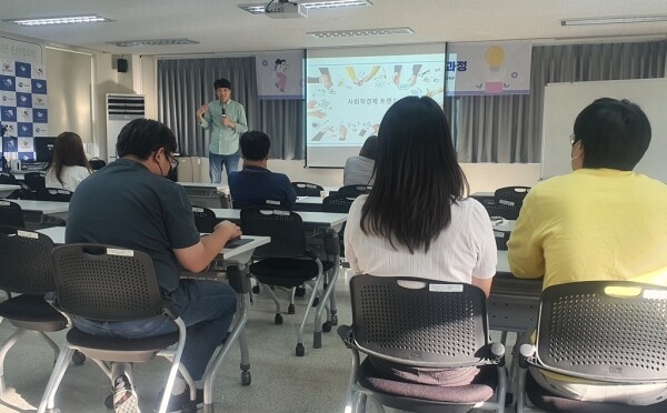 창업실무과정은 사회적경제기업으로 진입할 예비창업자를 대상으로 다양한 창업공모사업에 지원할 수 있도록 멘토링하는 수업으로 첫 번째 시간은 강남대학교 엄주환 교수가 사회적경제란 무엇이며 어떤 소셜미션에 집중해야 하는 것인지에 대해 알려주어 수강생들의 호응을 얻었다.