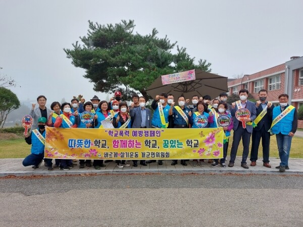 이날 캠페인에는 이광범 개군면장, 김선용 개군면 파출소장 등이 참석해 개군면 관내 아이들을 보호하기 위해 힘을 보탰고 학생들이 코로나19와 학교폭력으로부터 건강하고 행복하게 성장할 수 있도록 안전한 면학 분위기 조성을 위한 학교폭력 방지 현수막 및 피켓을 들고 캠페인을 벌였다.