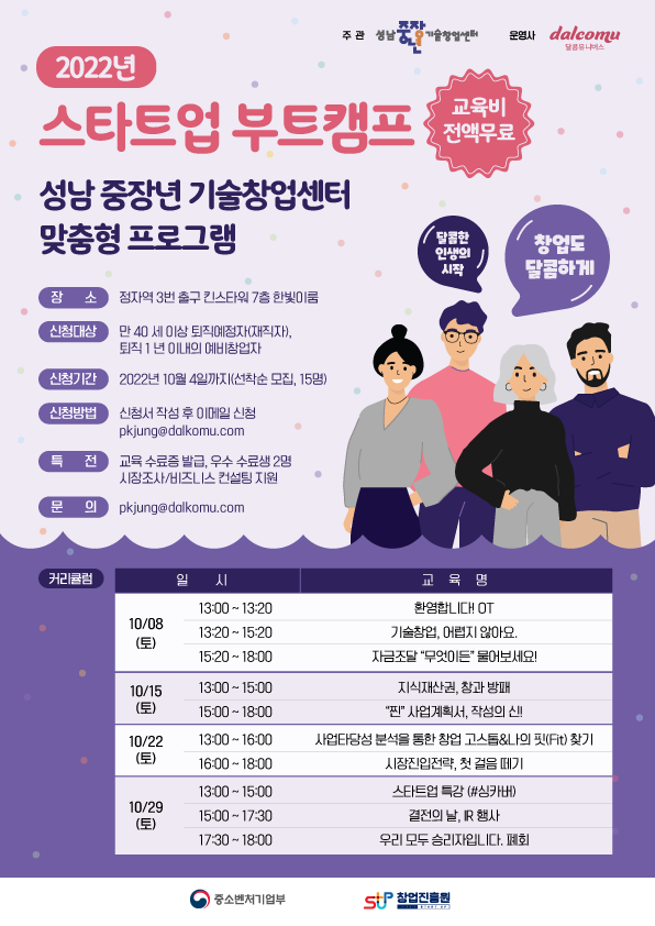 스타트업 부트캠프는 성남 중장년 기술창업센터에서 ‘2022년 중장년 기술창업센터 세부관리기준 개정안 제 28조’에 의거해 만 40세 이상 퇴직 예정자 및 퇴직 1년 이내의 예비창업자의 창업 성공률을 제고하기 위해 마련했다.