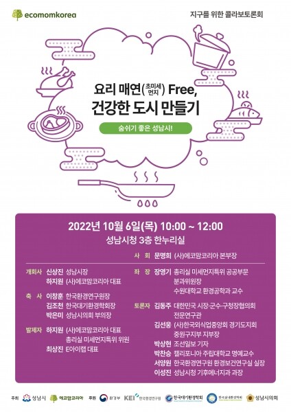 성남시와 ㈔에코맘코리아가 공동 주최하는 이날 토론회는 ‘요리 매연 없이 숨쉬기 좋은 성남시 만들기’를 주제로 열린다.
