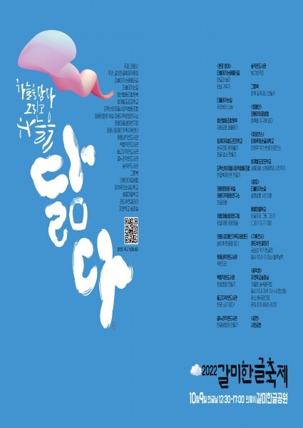 지난 2년 동안 코로나19로 인해 온라인과 각 현장에서 따로 진행됐던 갈미한글축제는 긴 기다림 끝에 올해는 대면 행사로 개최해 한글의 우수성을 알리고 공동체 회복을 위한 축제의 장을 펼치는 뜻깊은 자리를 마련할 예정이다.