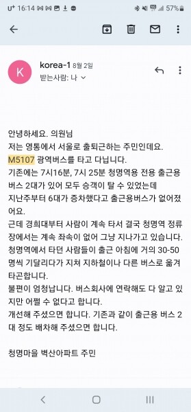 해당 노선의 시점에서 이미 버스가 만차로 운행되면서 서울로 출퇴근하는 영통 주민들의 불편을 초래해 왔다 이 의원은 “M-bus를 총괄 관리하는 국토교통부 대도시권광역교통위원회, 수원시 그리고 경기도에 M5107번 버스의 노선 증차 또는 중간 출발 정류소 운영 복구를 촉구했다”며 “대광위 지침 개정으로 11월 1일부터 전세버스를 2대 증차해 기착지에 추가 투입하고 그럼에도 청명역에서 계속해 입석이 발생하면 중간 출발 정류소에서의 출발을 검토하겠다는 확답을 받았다”고 말했다.