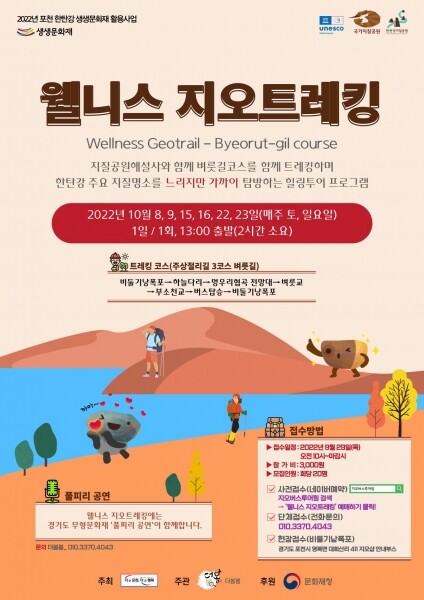 ‘웰니스 지오트레킹’은 문화재청에서 후원하고 포천시에서 주최하며 더봄봄에서 주관하는 ‘포천 한탄강 생생문화재 사업’으로 한탄강 유네스코 세계지질공원을 느리지만 가까이에서 탐방할 수 있어 참가자들에게 특별한 경험을 선사할 예정이다.