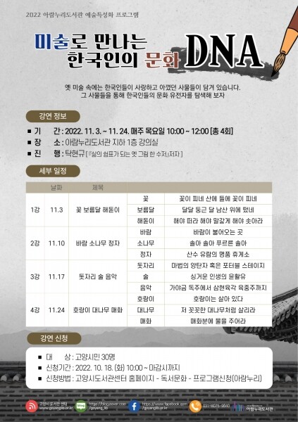 한편 예술 특성화 도서관인 아람누리도서관은 시민들이 예술의 세부 주제를 폭넓게 접할 수 있도록 연중 예술관련 프로그램을 운영하고 있다.