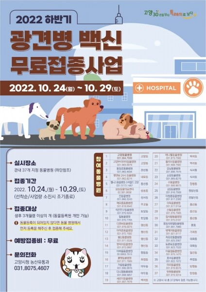 접종을 원하는 시민은 고양시 홈페이지에서 가까운 지정 동물병원 확인 후 방문하면 된다.