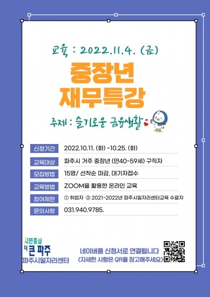 정훈수 일자리경제과장은 “고물가·고금리·고환율의 '3고시대'를 맞아 경제 상황이 급속히 악화됨에 따라 은퇴를 앞둔 중장년층의 일자리와 연금대책이 절실해졌다”며 “이번 특강이 중장년 교육생들의 체계적인 재무관리와 안정적인 노후설계에 도움이 되길 바란다”고 말했다.