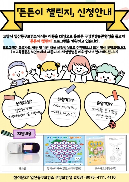 일산동구보건소는 지역아동센터 및 관내 어린이집 아동을 대상으로 총 6주간 구강보건교육 ‘튼튼이 챌린지’ 프로그램을 진행할 예정이다.