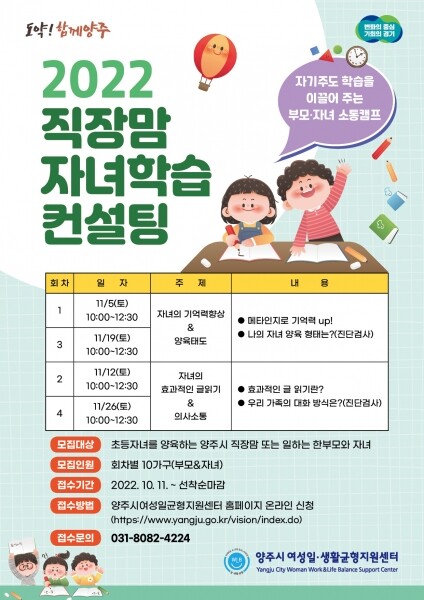 양주시에 거주하는 초등학생 자녀를 양육중인 직장맘이라면 누구나 무료로 참가 가능하며 프로그램은 양주시여성일·생활균형지원센터에서 대면으로 진행할 예정이다.