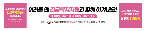 이태희 복지정책과장은 “완화기준 종료 시까지 복지혜택을 받지 못하는 취약계층과 공적급여 탈락 가구 등 긴급복지 지원이 가능한 분들을 선제적으로 찾아, 위기 해소에 필요한 생계, 의료, 주거 서비스를 제공할 계획”이라고 말했다.