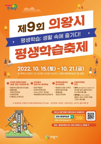 제9회 의왕시평생학습축제는 10월 15일 의왕시 평생학습관에서의 개막식을 시작으로 왕송호수공원 분수대 일원, 의왕문화원, 들락날락 일원, 왕림이팝아트홀 등에서 21일까지 축제가 진행될 예정이며 자세한 일정은 의왕시평생학습관 홈페이지를 확인하거나 의왕시 평생교육과로 문의하면 된다.