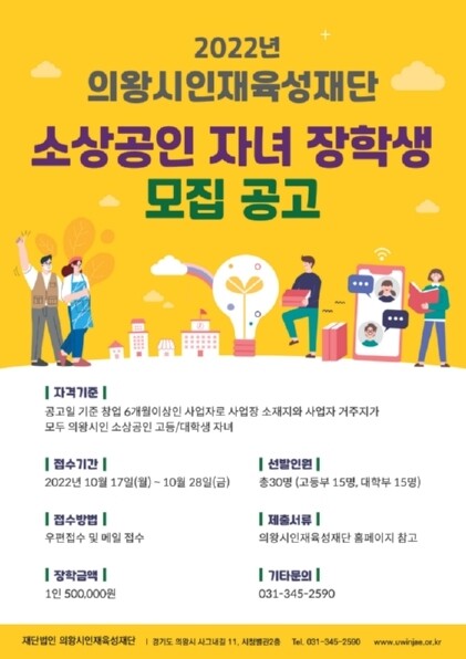 지원 자격은 공고일 기준 창업 6개월 이상인 사업자로 사업장 소재지와 사업자 거주지가 모두 의왕시인 소상공인의 고등학생·대학생 자녀이며 10월 17일부터 10월 28일까지 신청할 수 있다.