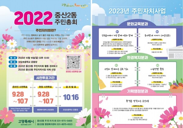 박응상 중산2동 주민자치회장은 “지난 7월부터 주민 설문조사를 시작으로 지역 현안 과제를 발굴하고 내년도 사업 선정을 위해 주민투표를 진행했다 참여해주신 주민여러분께 감사드리며 총회에서 그 결과를 같이 공유하는 자리에 참석해 주시길 바란다 또한 오랜만에 개최되는 축제도 즐거운 마음으로 참석하셔서 아름다운 가을날 우리 마을에 대한 좋은 추억을 만들 수 있길 바란다”고 전했다.