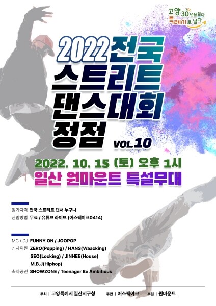 정윤식 일산서구청장은 “시민과 함께 일산서구 문화축제로 자리매김한 스트리트 댄스대회가 열리게 되어 뜻깊게 생각하며 댄스의 모든 것을 보여주는 자리인 만큼 많은 분들이 참여해 즐겁고 멋진 추억 만들어 가기를 바란다”고 밝혔다.