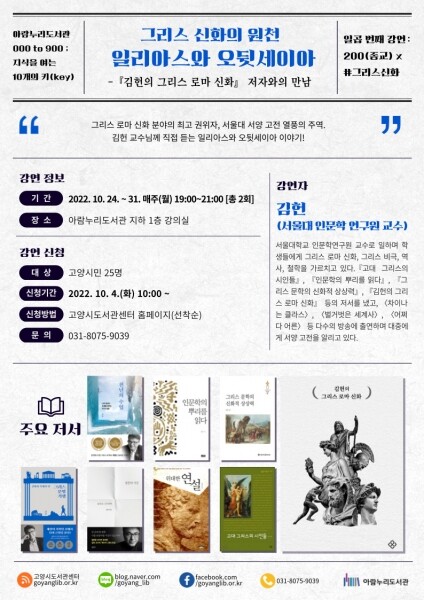 이번 강연은 ‘000 to 900’ 기획의 일곱 번째 강연으로 한국십진분류표상 200번대 ‘종교’ 분야 중에서도 그리스 신화 주제를 다룬다.